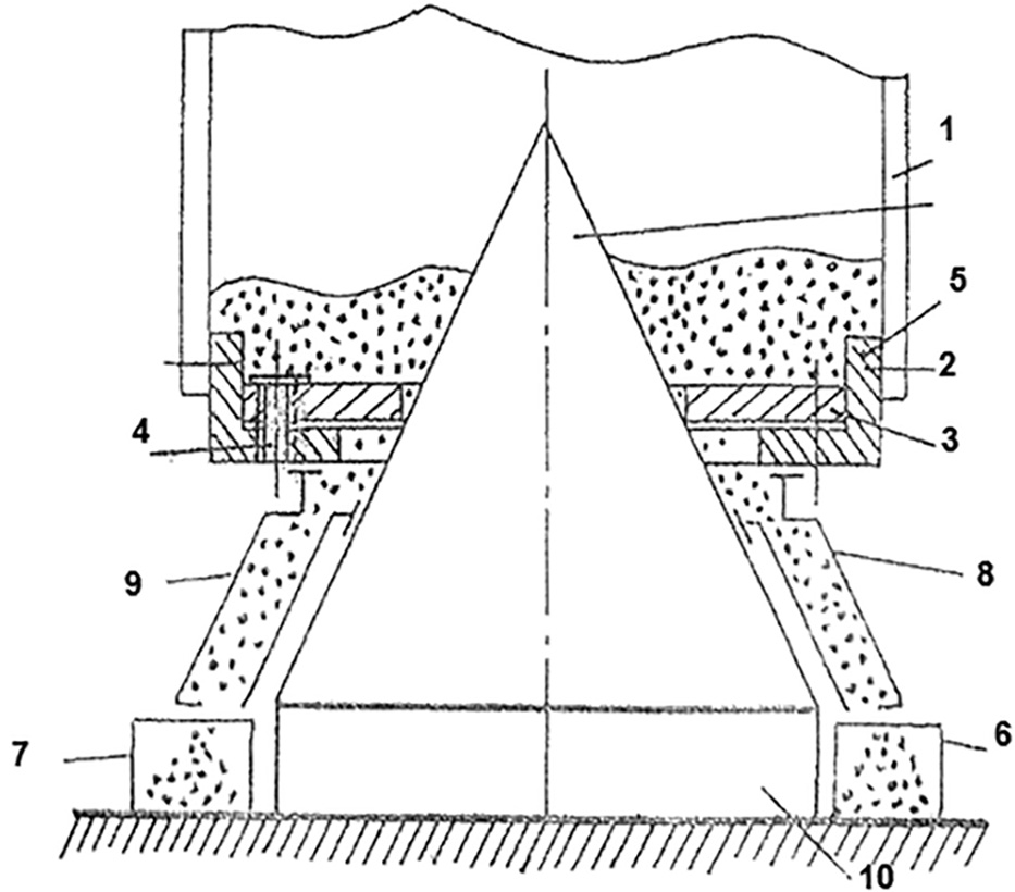 Сыпучий зернистый материал, помещенный в бункер 1, отсортировывается путем просыпания через окна сортировки [Fiseq(Hi)] (рис. 3; представлены только два) и собирается через трубки 8 и 9 в бункерах 6 и 7. Для обеспечения устойчивости установки для сортировки зернистых материалов основание правильной пирамиды 5 установлено на неподвижной опоре 10.
