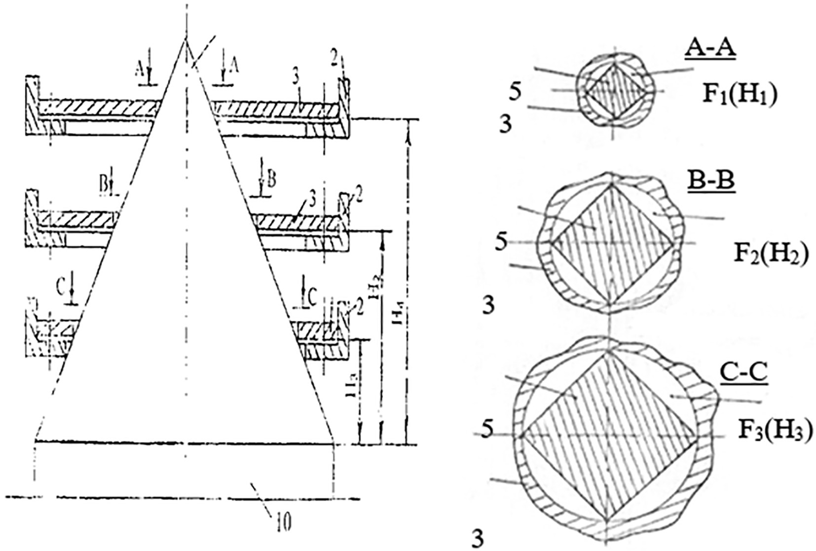 На дно 2 бункера 1 устанавливаются шайбы 3 различного внутреннего диаметра, обеспечивающие с боковой гранью правильной пирамиды 5 проходные сечения F, соответствующие размеру сортируемого зернистого материала (см. рис. 2, сечения А–А, В–В и С–С). Данное устройство разработано и применено в процессе сортировки.