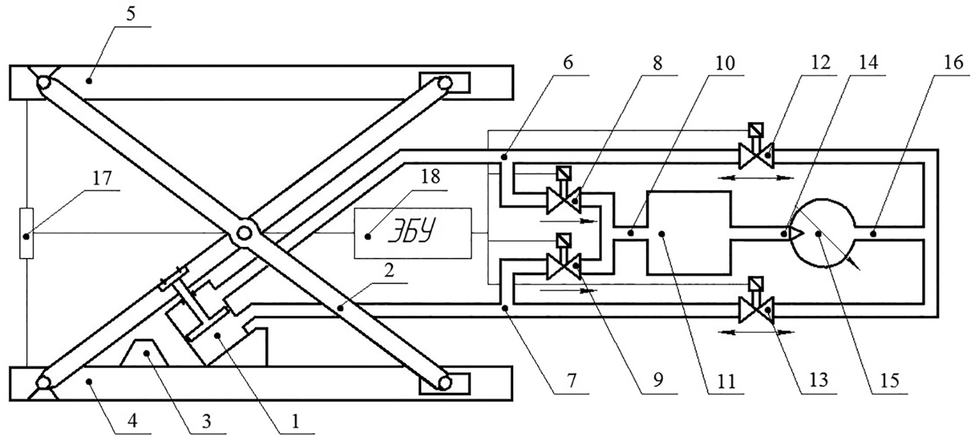 At the beginning of the compression stroke (Fig. 2, section d–0), a valve (8) closes and valves (12 and 13) open. When the upper base (5) reaches half of the full travel distance of the suspension, the above-piston and sub-piston cavities interconnect, and the air pressure within them is equal.