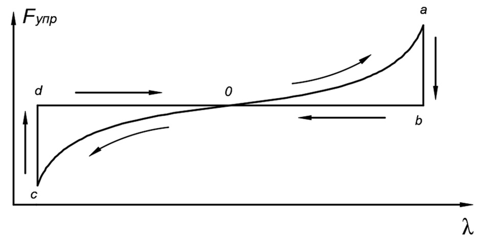 At the end of the compression stroke (Fig. 2, section a–b), when the deformation rate reaches zero, the signal from the sensor (17) is processed by the control unit (18), which generates a control action to open a valve (9) and close a valve (12). The working fluid flows from the sub-piston cavity of the pneumocylinder (1) due to overpressure in the receiver (11).