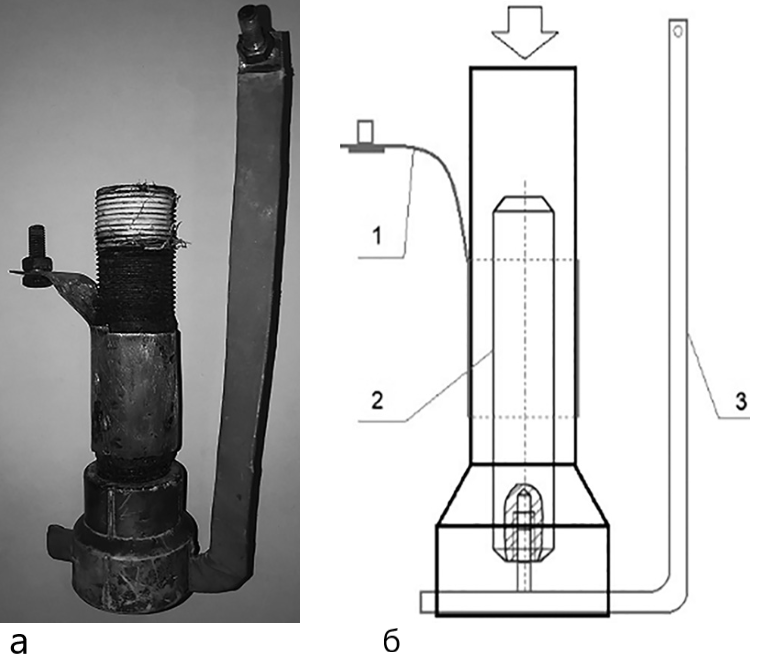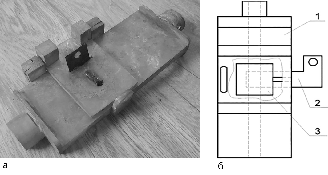 Рис. 2. Ячейка для нанесения осадков на образцы при исследовании их прочности сцепления с основой: а) общий вид ячейки; б) схема ячейки: 1 – анод; 2 – образец; 3 – катод
