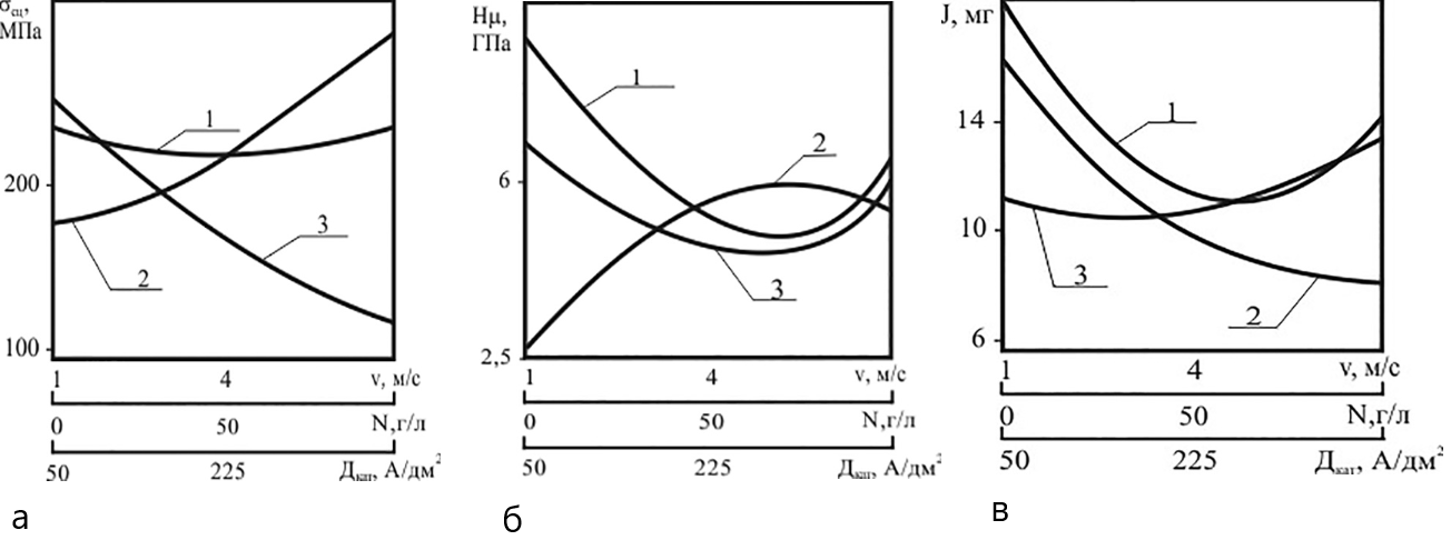 Рис. 4. Влияние параметров электролиза на прочность сцепления покрытия с основой (а), микротвердость (б) и износ (в): 1 – скорость потока электролита-суспензии; 2 – содержание дисперсных частиц; 3 – катодная плотность тока