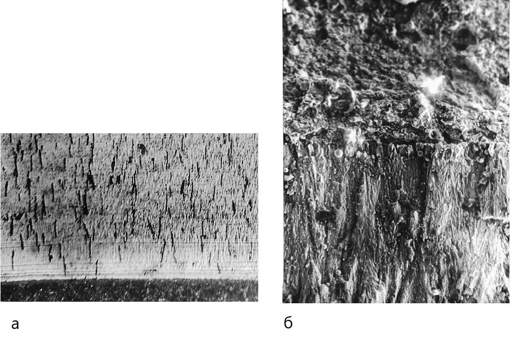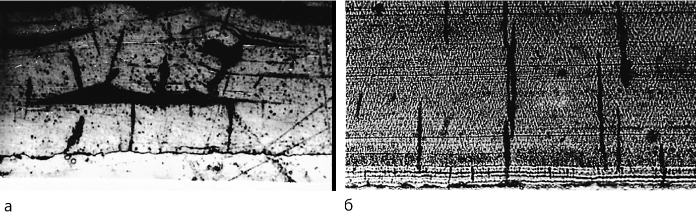 Рис. 5. Влияние условий электролиза на микроструктуру электроосажденного железа (×400): а) разрушенные разупрочненные осадки; б) монолитные осадки