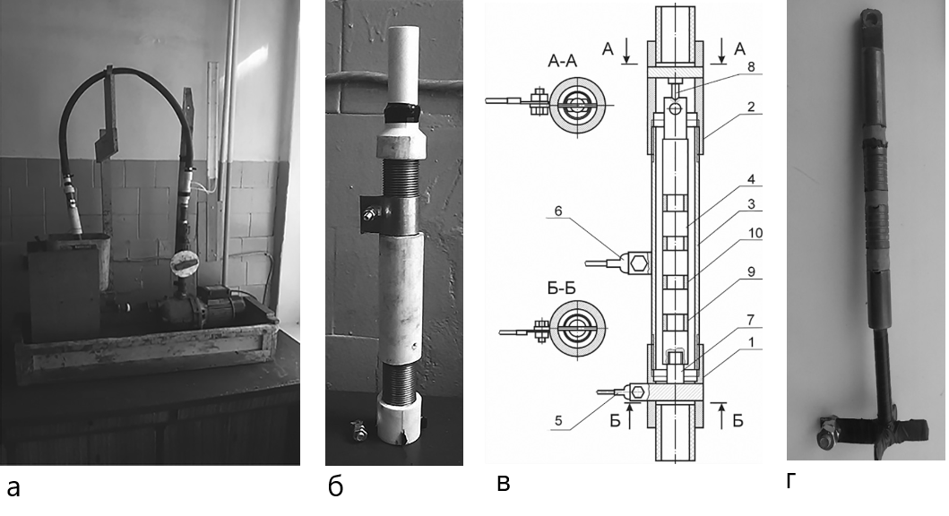 Рис. 7. Общий вид установки (а) и ячейки (б), схема ячейки (в) и золотник гидрораспределителя Р 100 после нанесения покрытия (г)