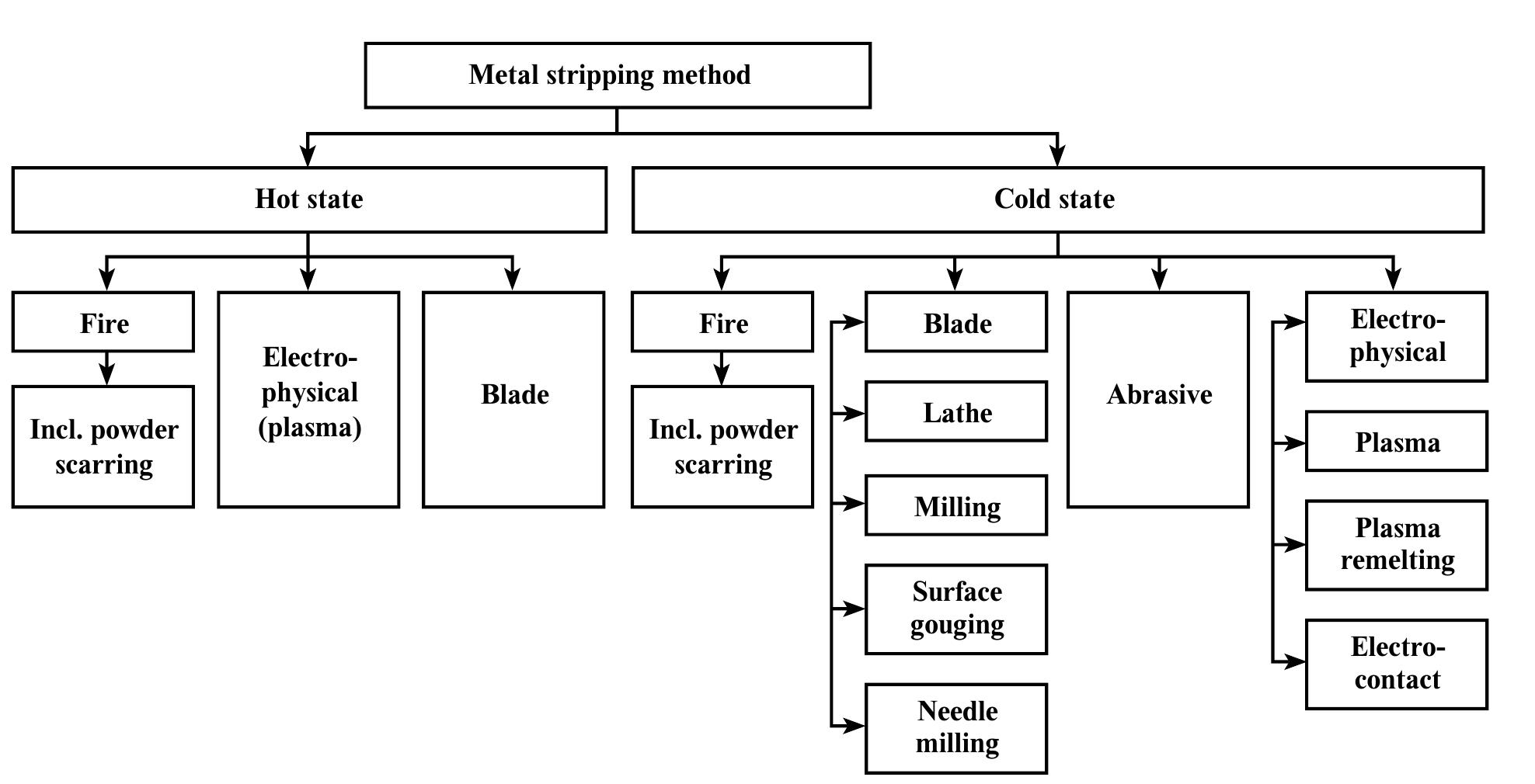 When choosing a stripping method (Fig. 2), the productivity and process cost factors; the possibility of organizing a continuous-sequential technological cycle; the combination of the rolling process with defective layer removal; the ability to process various steels and alloys; the extent of waste disposal; environmental pollution; as well as automation and mechanization of the process must be considered [9].