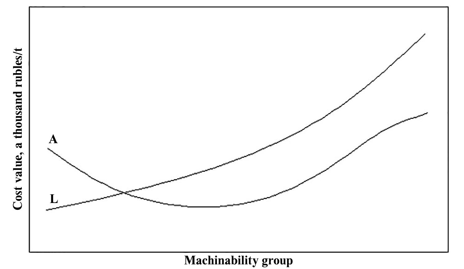 Fig. 3. The value of the cost of removing 1 ton of a defective layer without taking into account metal losses in processing waste: L – blade processing; A – abrasive processing