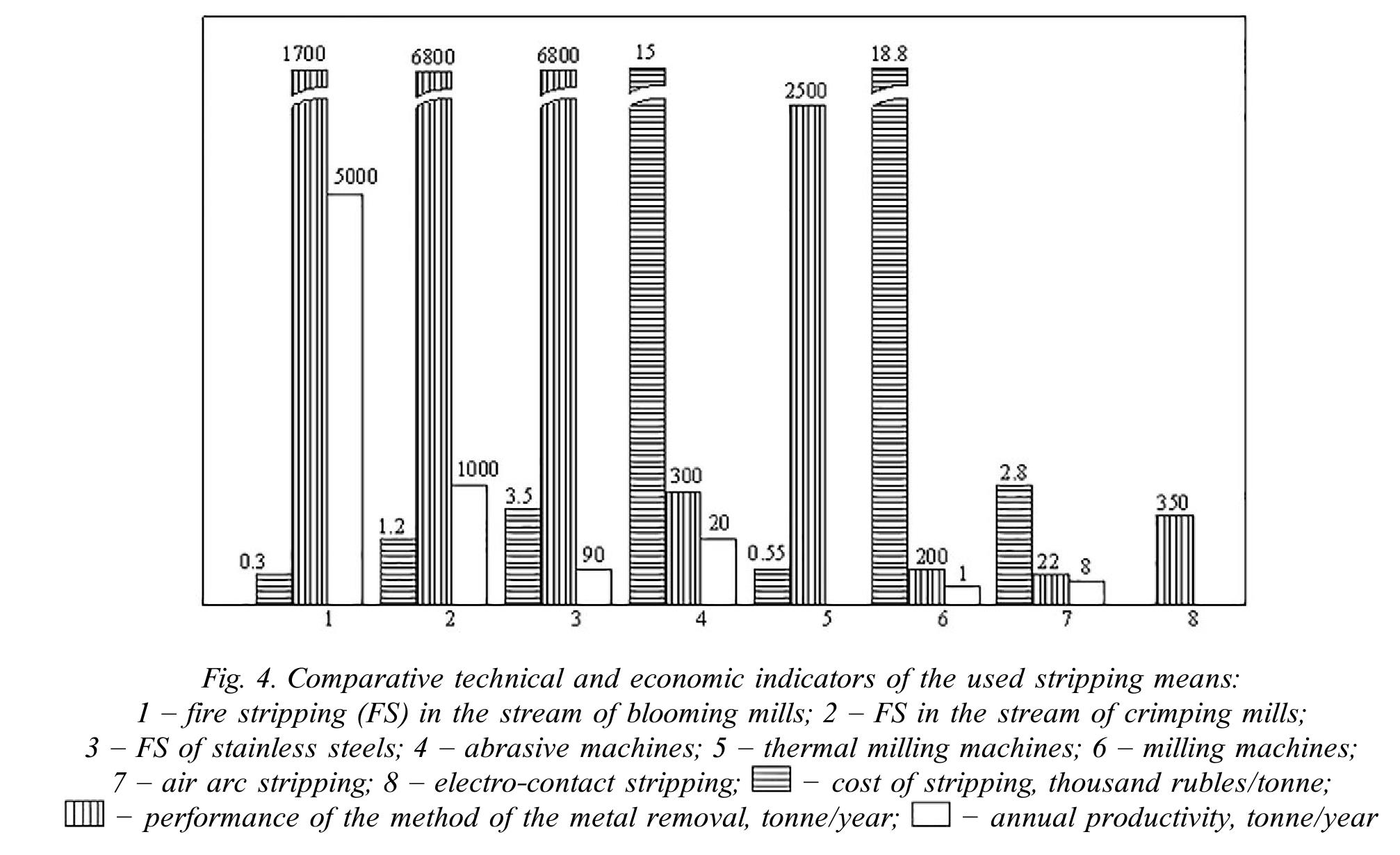 Simultaneously, the above analysis gives only a general idea of the technological aspects of these two cleaning methods and does not enable assessing the economic efficiency of their application. The reason is that the analysis does not consider the metal loss as waste because the metal can be recycled. The recycling is considered a significant factor, as billets from expensive steel grades are subjected to continuous lathing or grinding.