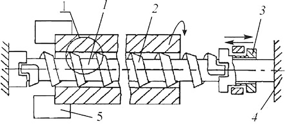 Fig. 6. Screw-cutting tool (SCT): I – mandrel; 2 – SCT; 3 – bushing; 4 – tailstock; 5 – lathe chuck
