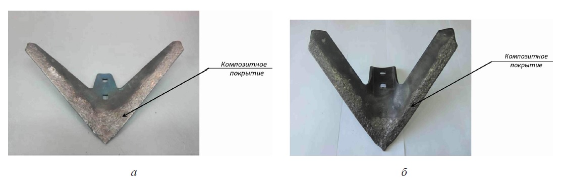 Рис. 2. Стрельчатые лапы культиватора КПС-4Г (а) и посевного комплекса John Deere 730 (б), упрочненные КВДУ с использованием разработанной рациональной ресурсосберегающей технологии
