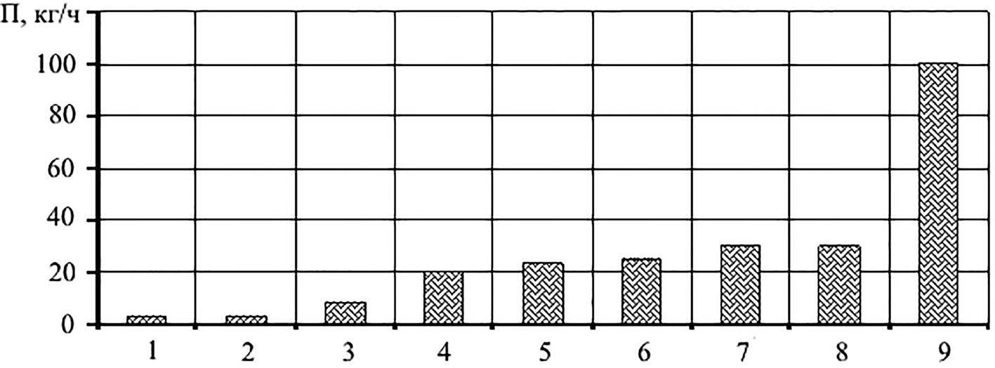 Рис. 2. Сравнение производительности различных способов наплавки: 1 – ручная электродуговая; 2 – вибродуговая; 3 – в атмосфере углекислого газа; 4 – индукционная; 5 – под флюсом одним электродом; 6 – многоэлектродная ЭШН; 7 – плазменная с подачей двух плавящихся электродов; 8 – автоматическая под флюсом электродной лентой; 9 – ЭШН электродом большого сечения