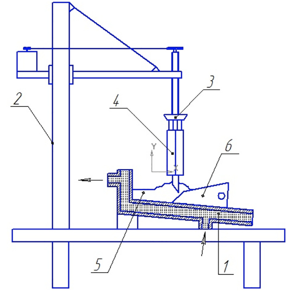 Рис. 3. Схема лабораторной установки для ЭШН: 1 – кристаллизатор; 2 – наплавочная установка; 3 – держатель электрода; 4 – расходуемый электрод; 5 – шихта; 6 – восстанавливаемая деталь