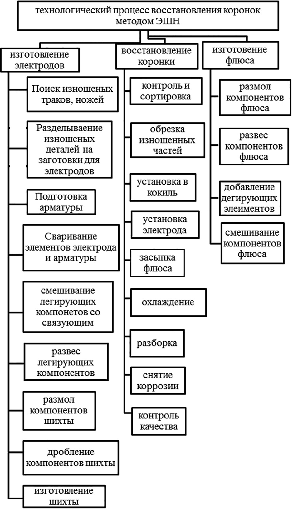 Заключительные операции, включающие: охлаждение коронки, разборку кокиля, снятие восстановленной коронки и ее очистка от шлаковой корки, контроль качества восстановления. Общая схема технологического процесса восстановления коронок представлена на рис. 6.