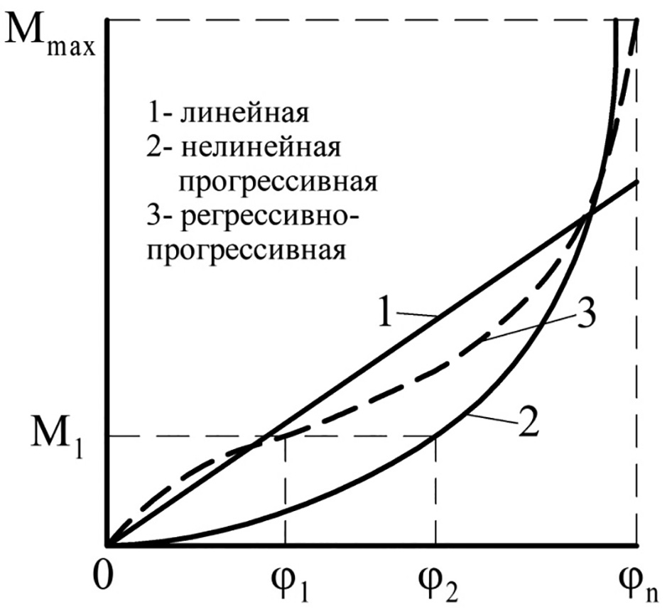 Анализ литературы и существующих конструкций упругих приводов показал, что наиболее эффективной является регрессивно-прогрессивная характеристика, имеющая большую жесткость при высоких нагрузках и запас потенциальной энергии при работе с незначительными нагрузками (рис. 1) [4–6].