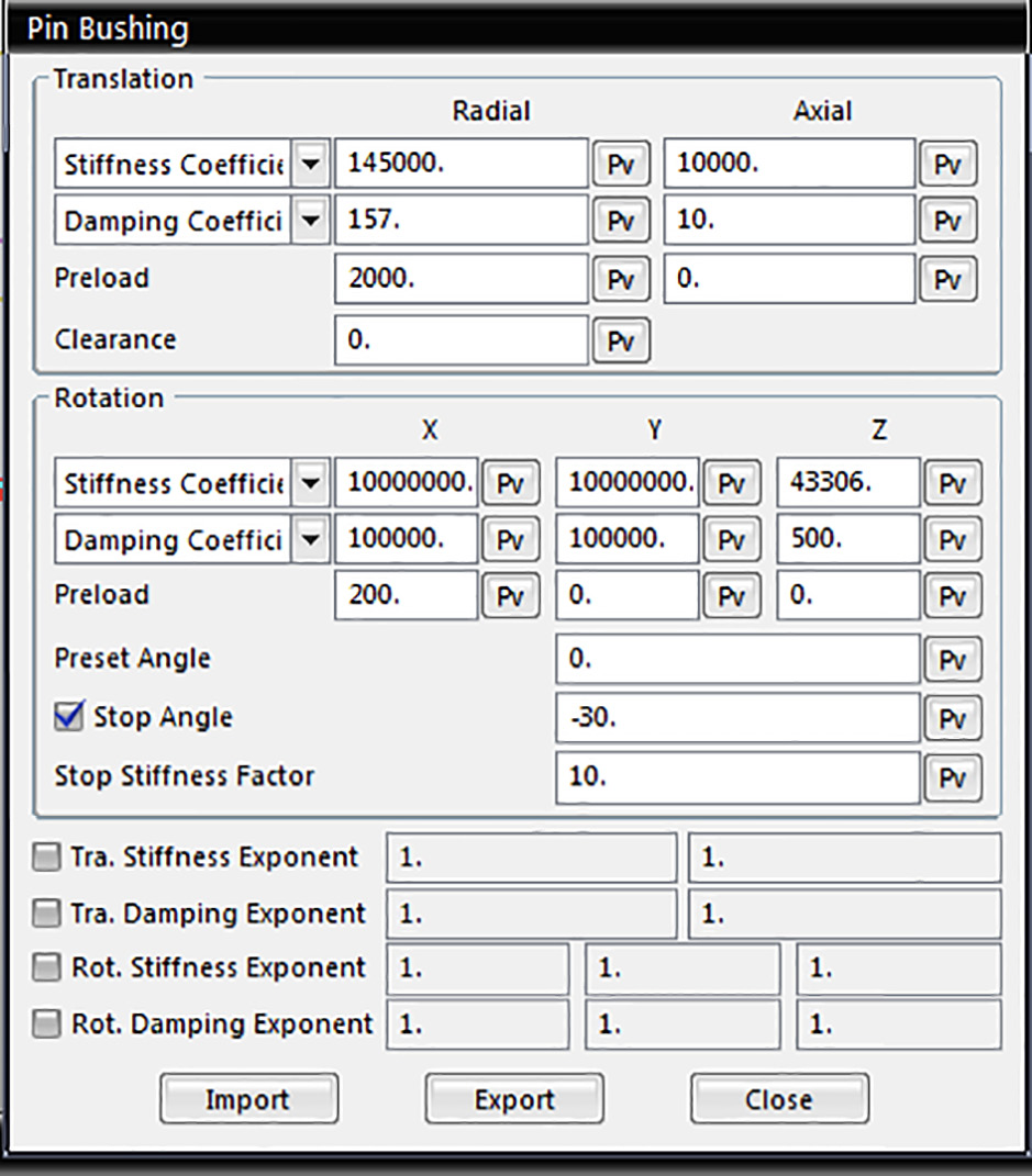 В качестве примера при исследовании принято: подрессоренная масса машины 30000 кг, моменты инерции относительно осей, проходящих через центр масс Jx = 24728 кг·м2, Jy = 100300 кг·м2 и Jz = 91343 кг·м2. Значения коэффициентов жесткости (Stiffness Coefficient) и демпфирования (Damping Coefficient) резино-металлических шарниров (РМШ) в радиальном (Radial) и угловом (Rotation) относительно продольной оси симметрии Z шарнира направлениях для трака шириной 460 мм были определены расчетным путем на основании экспериментальных исследований, представленных в работах [11, 12]. Остальные значения были приняты равными по умолчанию в RecurDyn (рис. 2).