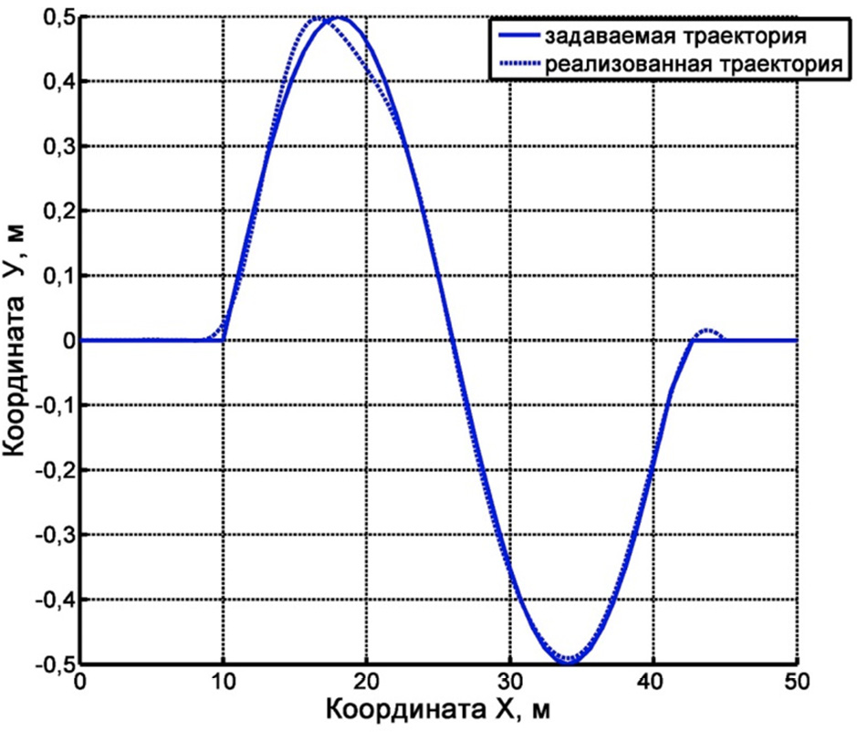 Рис. 9. Задаваемая и реализованная траектории при выполнении маневра «змейка»