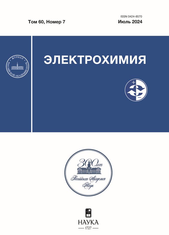 A test study of a hydrophobized gas diffusion electrode with a tin catalyst deposited on acetylene black A437E was carried out in order to identify its potential for intensifying the process of electroreduction of CO2 to formate in acidic and alkaline aqueous solutions. Porous electrodes with a fluoroplastic content of 40 wt. %, thickness 0.5 mm, porosity 60 vol. % and tin content ≈0.7 mg/cm2, relative to the overall surface of the electrode were studied. It has been shown that, on this type of electrodes, it is possible to carry out the electroreduction of CO2 at a current density of up to 900 mA/cm2, at temperatures of 25–55°C with a formate flow yield of 74 to 96%. Electrolysis for 4 hours with a current density of 190 mA/cm2 resulted in a solution of potassium formate with a concentration of 1.58 M. In this case, an increase in the capacity of the double electrical layer was observed from 7 to 17 mF/cm2 and a decrease in current efficiency from 96 to 58%.