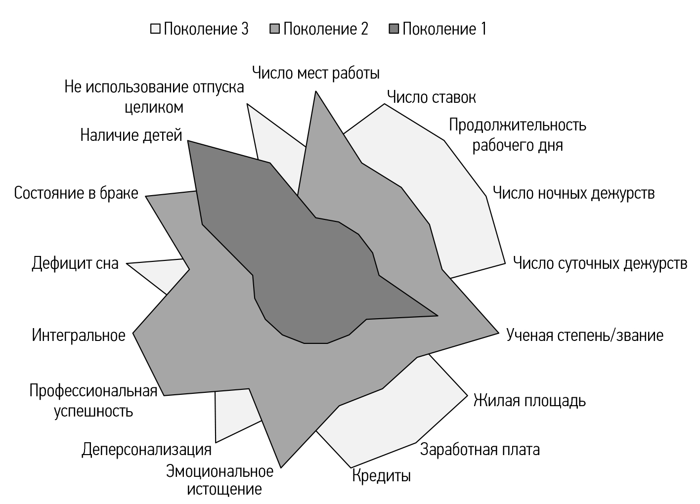 Рис. 2. Модель профессионального выгорания, профессиональных и социоэкономических параметров врачей — представителей различных поколений.