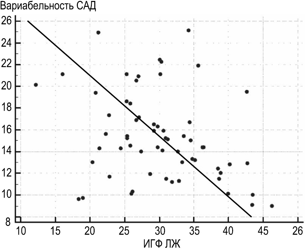 В табл. 1 представлены результаты корреляционного анализа параметров суточного мониторирования АД и других клинических характеристик пациентов с ИГФ ЛЖ. Установлена достоверная обратная слабая корреляция ИГФ ЛЖ с возрастом, индексом массы тела, вариабельностью АД (рис. 1) и среднедневными значениями систолического артериального давления (САД) и диастолического артериального давления (ДАД).