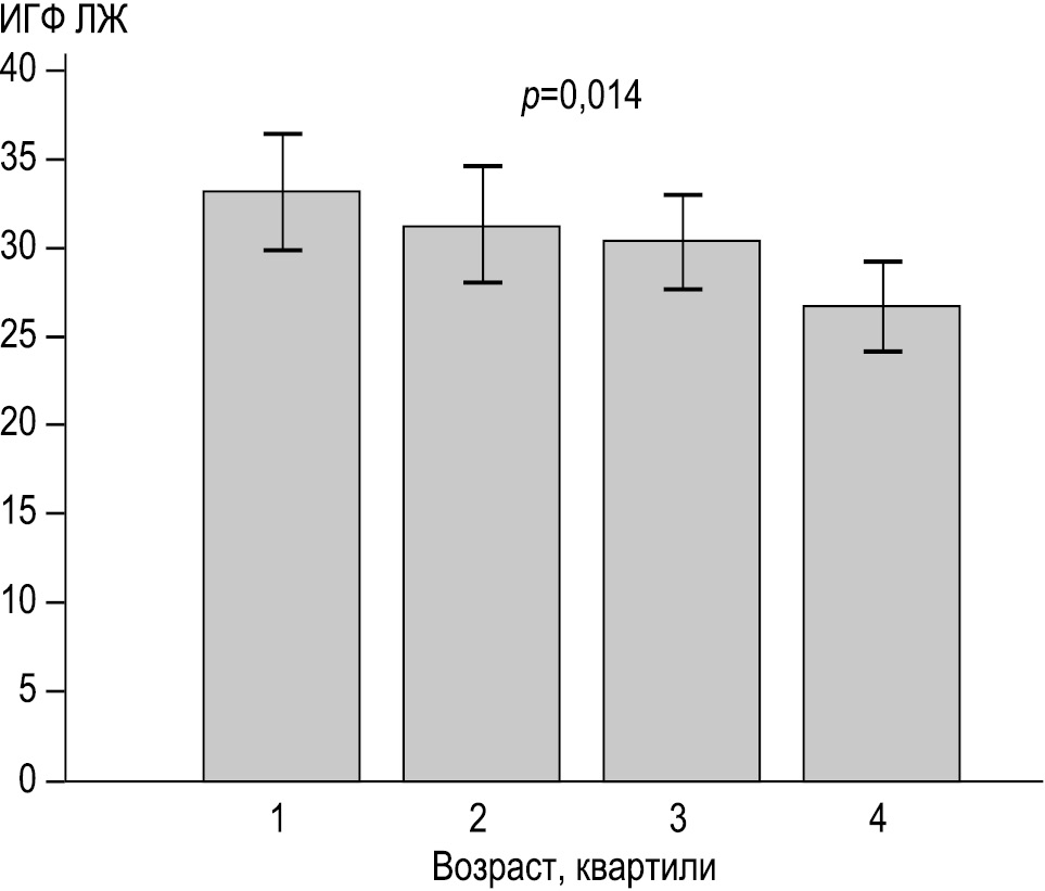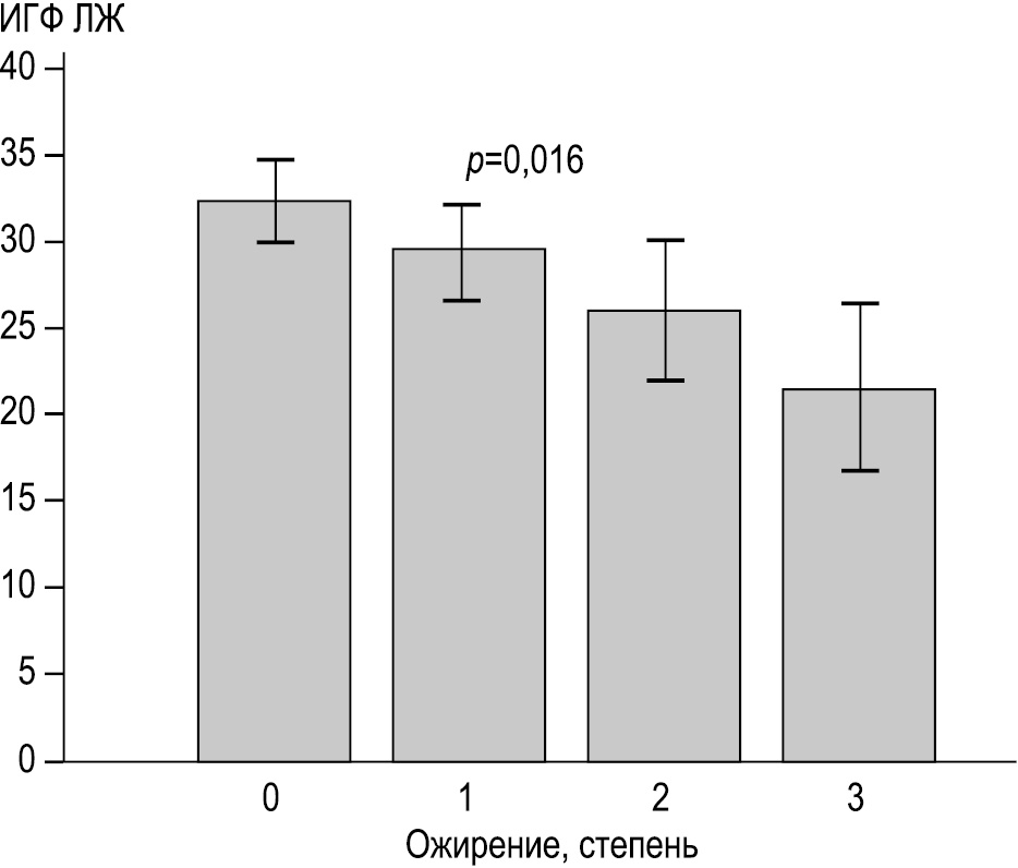 Одним из наиболее значимых факторов, ассоциированных со снижением ИГФ ЛЖ, оказался индекс массы тела. Известно, что ожирение у пациентов с АГ может быть одним из факторов, способствующих раннему развитию поражения сердца. В исследовании, проведенном на группе из 535 пациентов с АГ или ожирением, было показано, что увеличение индекса массы тела ассоциировано с изменением геометрии ЛЖ и снижением показателей продольного стрейна ЛЖ. При этом индекс массы тела оказался более существенным фактором, влияющим на геометрию ЛЖ, чем наличие АГ [4].