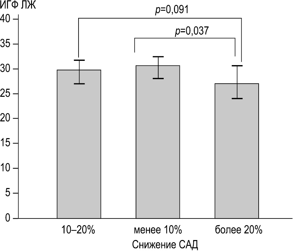 Повышенная вариабельность САД по данным суточного мониторирования оказалась самым значимым предиктором формирования увеличения массы миокарда по данным трансторакальной ЭхоКГ, формирования диастолической дисфункции по данным тканевой доплерографии и развития деформации миокарда по данным продольного стрейна ЛЖ в группе из 114 пациентов с АГ [5]. Ранние признаки нарушения деформации миокарда, выявленные по данным исследования продольного стрейна ЛЖ, коррелировали прежде всего с суточной вариабельностью АД и дневными значениями АД, преимущественно диастолического [6]. Ассоциация между увеличением вариабельности АД и изменением миокарда ЛЖ у пациентов с АГ подтверждена не всеми исследованиями. Например, при анализе данных группы из 305 пациентов с АГ и сахарным диабетом такой ассоциации обнаружено не было [7]. В нашем исследовании мы анализировали не массу миокарда, а ИГФ ЛЖ. Для этого показателя вариабельность САД оказалась важным предиктором нарушения функции ЛЖ у пациентов с АГ.