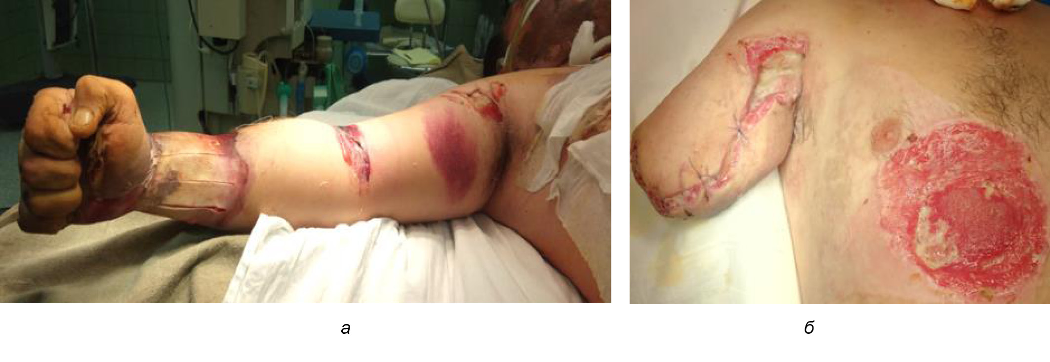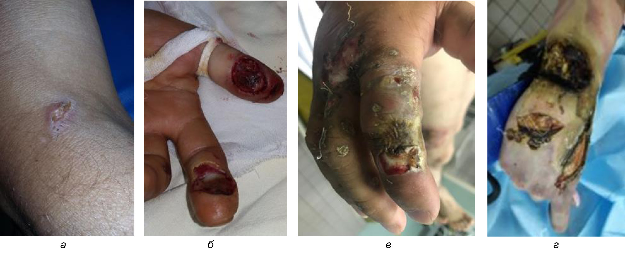 Места «входа» и/или «выхода» тока представляли собой участки некрозов кожи либо дефекты кожи размерами от нескольких миллиметров («меток тока») до обширных, захватывающих один и более сегментов конечности (рис. 1).