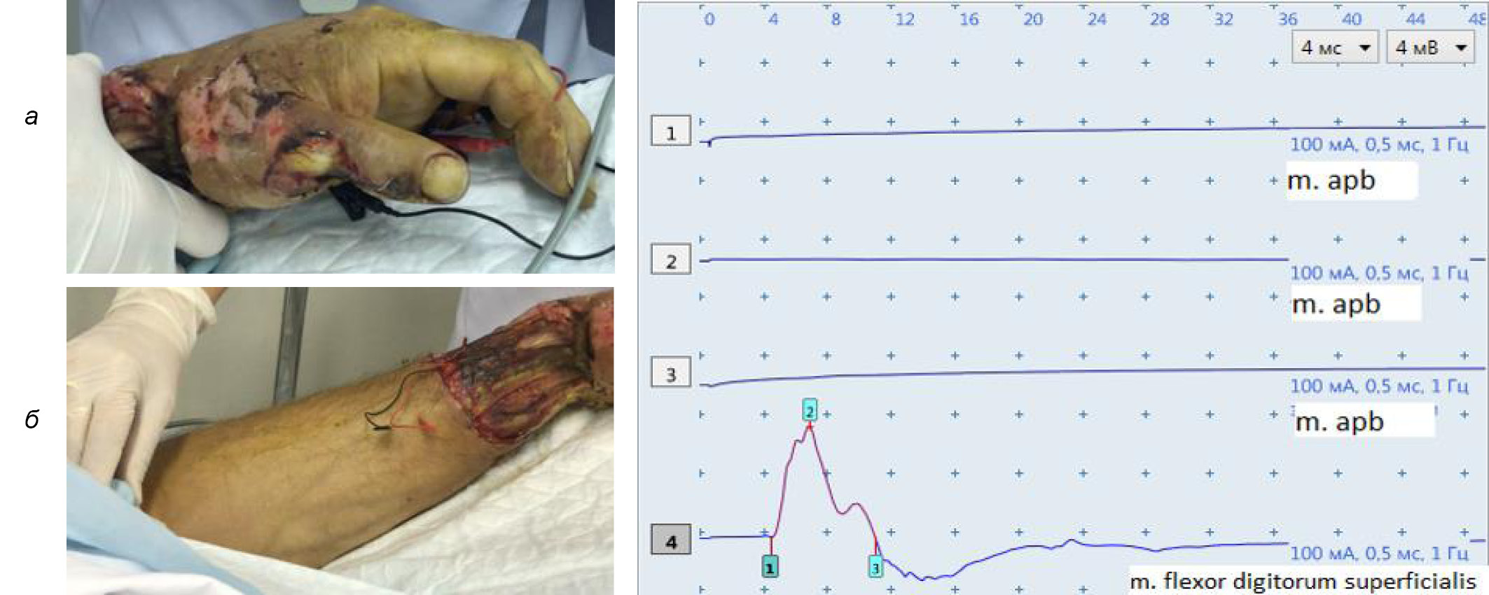 Для определения жизнеспособности нервов и мышечной ткани верхних конечностей 12 пациентам со сниженной тактильной и болевой чувствительностью, а также с нарушением двигательной функции конечности в первые трое суток была выполнена стимуляционная ЭНМГ и игольчатая нейромиография (НМГ). С целью определения жизнеспособности нервов сначала выполняли стимуляционную ЭНМГ с применением накожных адгезивных регистрирующих электродов по стандартной методике, а затем повторяли исследование с применением игольчатых регистрирующих электродов для определения или исключения влияния таких факторов, как повреждение и изменение кожного покрова, отек мягких тканей [17, 18]. При стимуляционной ЭНМГ оценивали уровень поражения срединного, локтевого и лучевого нервов с использованием адгезивных накожных и игольчатых электродов. В дополнение к стимуляционной ЭНМГ также применяли игольчатую НМГ для определения жизнеспособности мышцы и оценивали наличие или отсутствие спонтанной активности.