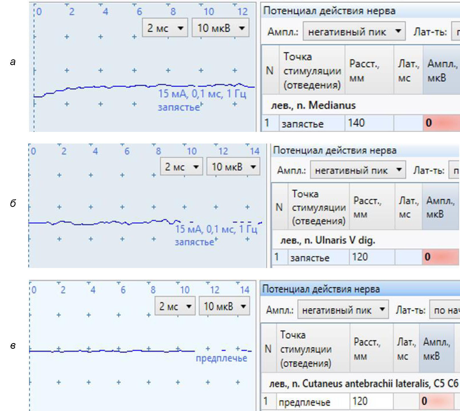 Рис. 5. Блок проведения по сенсорным волокнам срединного (а), локтевого (б) и лучевого (в) нервов по данным ЭНМГ.