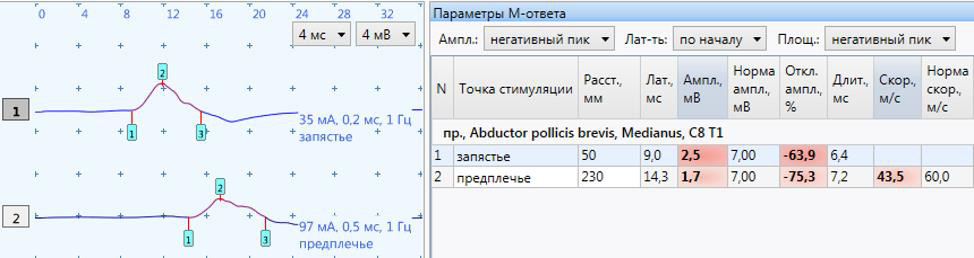Рис.6. Смешанный характер невропатии срединного нерва в виде снижения амплитуды М-ответа и скорости распространения возбуждения по моторным волокнам.