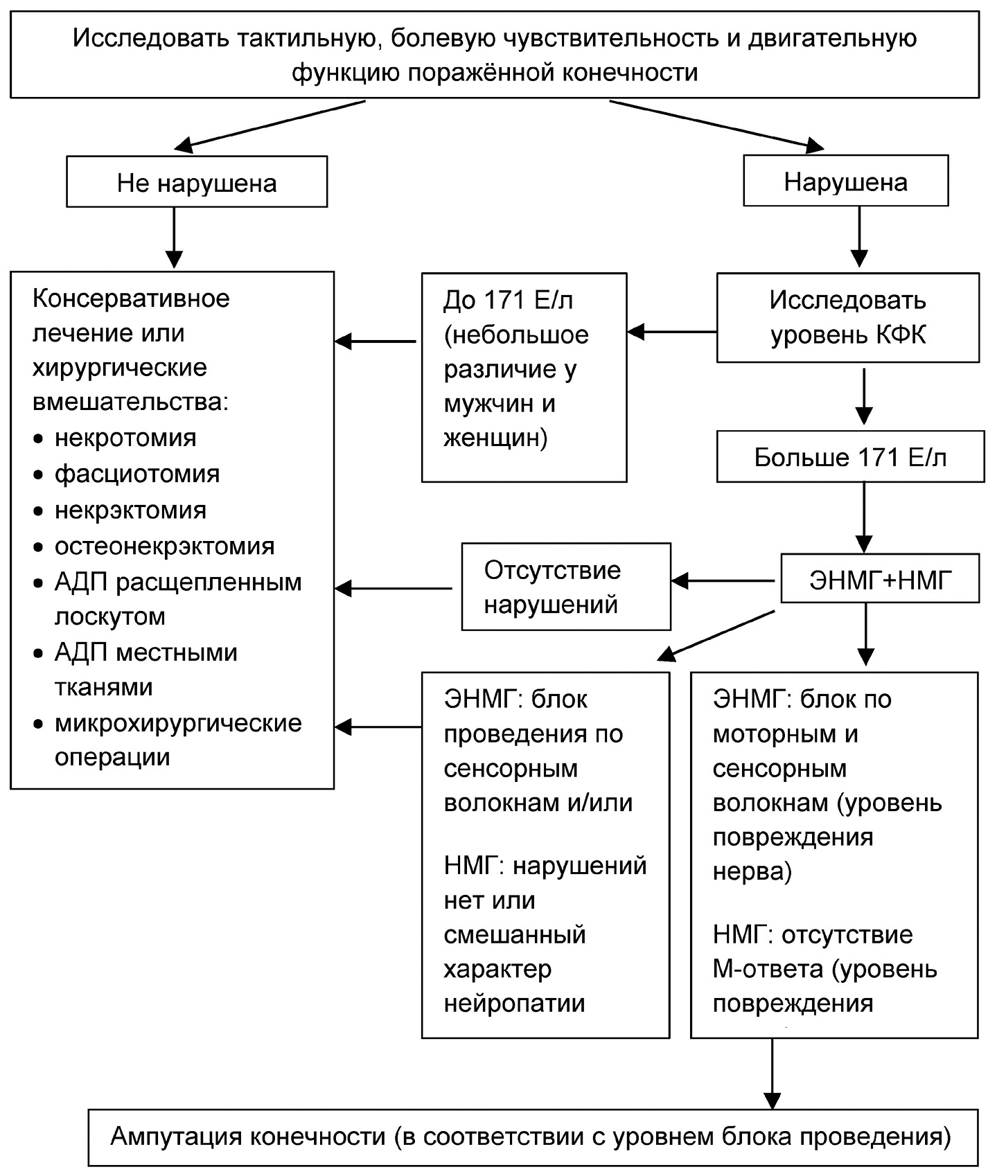 - При повышенном уровне КФК необходимо исследовать нервно-мышечную проводимость поражённой конечности при помощи стимуляционной ЭНМГ и игольчатой НМГ. При отсутствии нарушений или выявления блока проведения только по сенсорным волокнам при ЭНМГ и/или смешанного характера нейропатии при НМГ, проводить консервативное или оперативное лечение ран, не прибегая к ампутации.