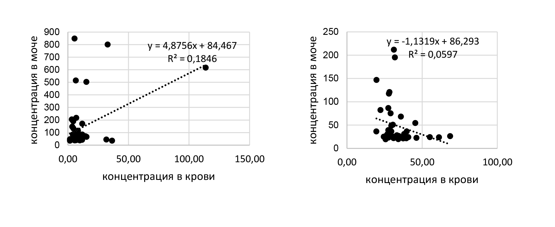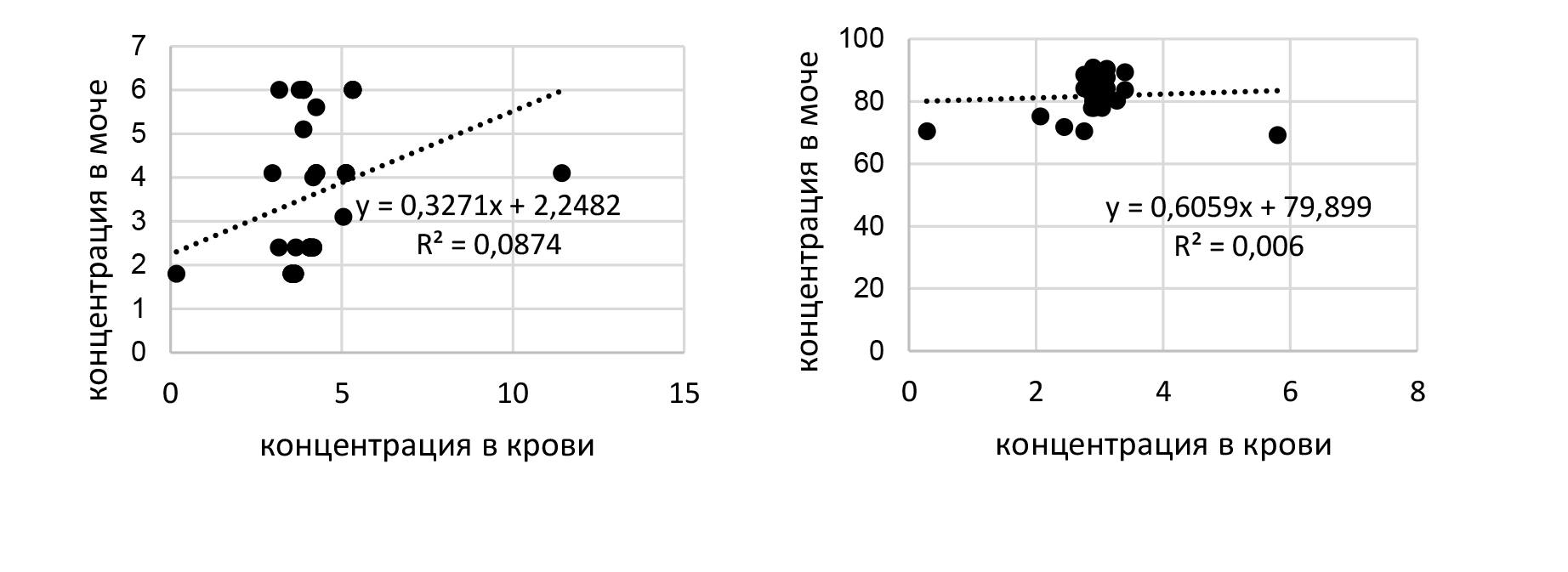 В контрольной группе уровни IL-8 в крови и моче коррелировали между собой слабой обратной связью (r=–0,256, p >0,05), аналогичное наблюдалось и в отношении IL-6 (r=–0,116, p >0,05).