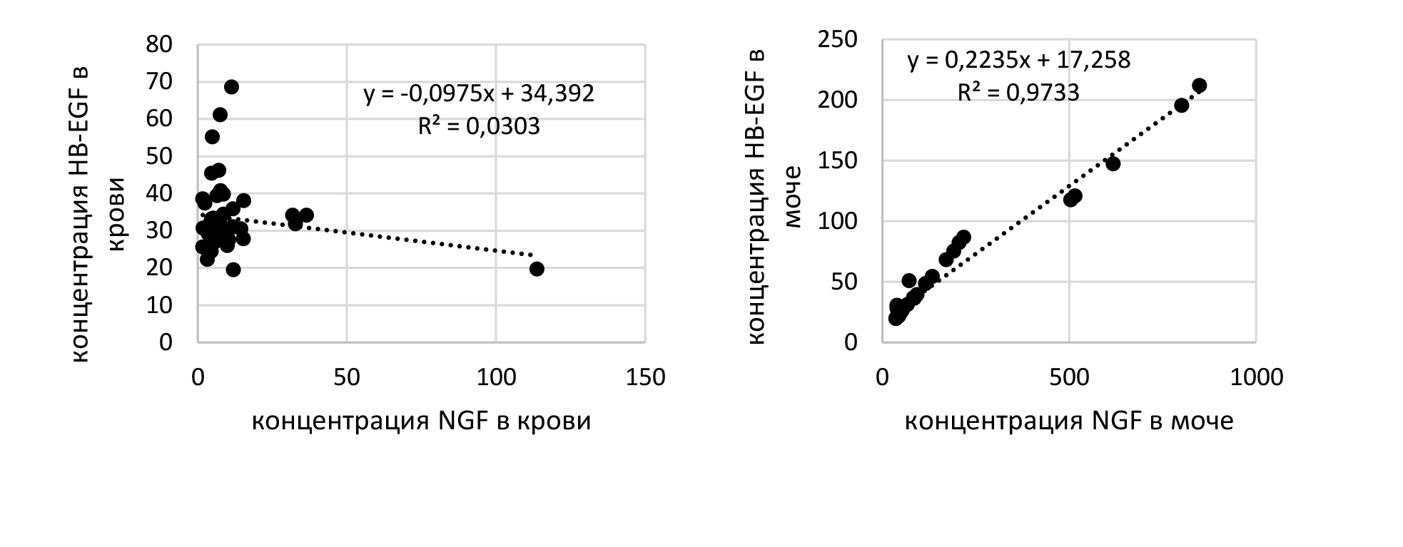 В процессе анализа полученных данных мы обратили внимание на то, что в основной группе уровень NGF в крови был незначительно повышен, а HB-EGF — снижен, тогда как в моче содержание этих маркеров было существенно повышено. Был проведен корреляционный анализ между содержанием этих показателей в крови и моче (рис. 3). Корреляционный анализ показал наличие слабой обратной связи (r=–0,174, p >0,05) между уровнями NGF и HB-EGF в крови (рис. 3а) и сильной прямой статистически значимой связи (r=+0,987, p <0,05) — в моче (рис. 3б).