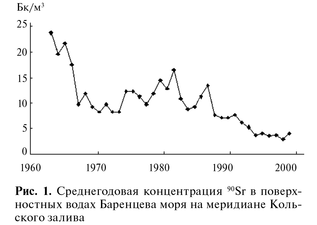 В Арктической зоне России заметный вклад в радиоактивное загрязнение Баренцева и Карского морей внесли атмосферные ядерные испытания на Новой Земле в 1955–1962 гг. Всего на этом полигоне было проведено 130 испытаний, в том числе 91 атмосферное (85 воздушных, 1 наземное, 2 надводных и 3 подводных). Их общая мощность составила около 90 % мощности всех атмосферных взрывов, произведённых в СССР. В результате в 1962–1963 гг. содержание 90Sr в поверхностных водах Баренцева моря достигло максимальных за всё время наблюдений значений – свыше 20 Бк/м3 [3–7] (рис. 1). После запрета в 1963 г. на проведение ядерных испытаний в трёх средах концентрация 90Sr в морской воде стала постепенно уменьшаться и в 1970 г. опустилась до значений 7–9 Бк/м3.