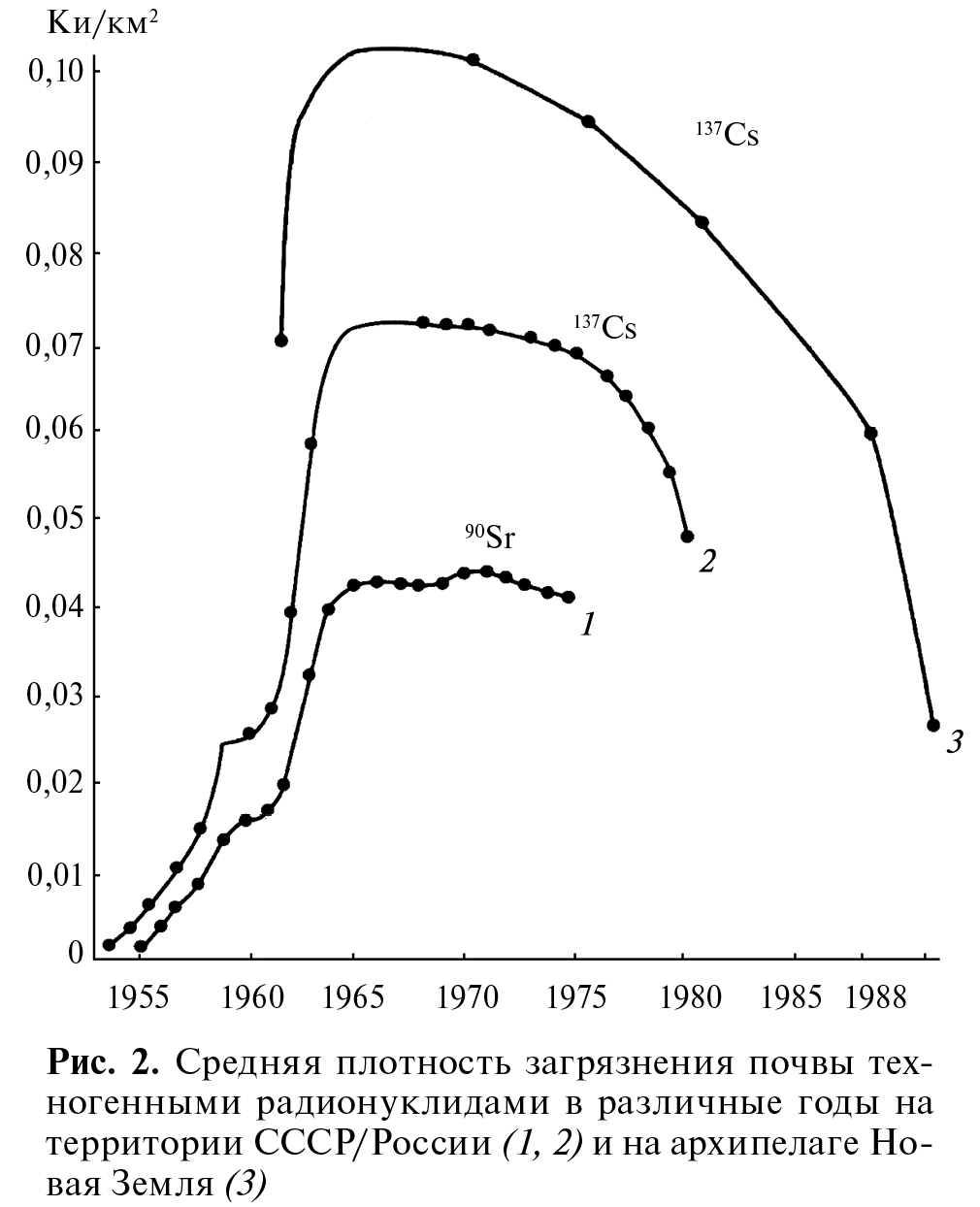 Рис. 2. Средняя плотность загрязнения почвы техногенными радионуклидами в различные годы на территории СССР/России (1, 2) и на архипелаге Новая Земля (3)