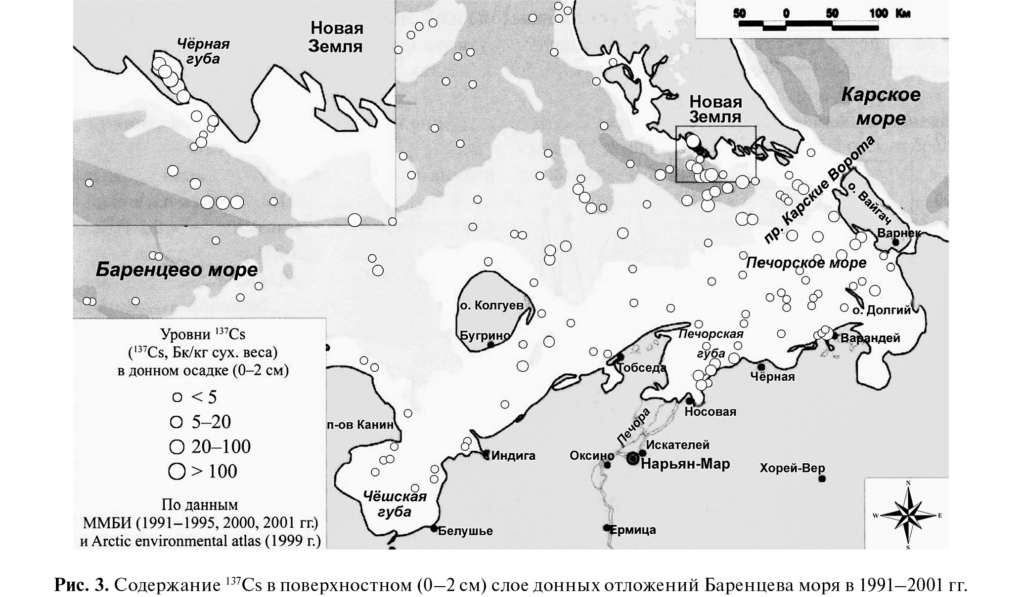 Похожая картина наблюдается и в отношении плотности загрязнения почвы 90Sr и 137Cs (рис. 2) [8] и поверхностного слоя донных отложений (рис. 3) [9–11]. Как видно из рисунка 3, исключение составляет Чёрная губа на южной оконечности Новой Земли со стороны Баренцева моря, где концентрация 137Cs в донных отложениях местами превышает 200 Бк/кг, а 139,140Pu – 7000 Бк/кг [12]. Это связано с проведёнными в этом месте надводными и подводными ядерными испытаниями.