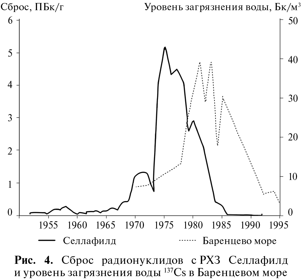 На рисунке 1 отражено повышение концентрации 90Sr в водах Баренцева моря в 1970-х годах. В 1972 г. наблюдениями западногерманского Гидрографического института были выявлены относительно высокие концентрации 134Cs (0,3 – 0,6 Бк/м3) в водах юго-западной части Баренцева моря. Этот факт объяснили поступлением радионуклидов с водами Норвежского течения, загрязнённого радиоактивными отходами с заводов по переработке отработавшего ядерного топлива. В 1978 г. экспедиция НПО "Тайфун" также обнаружила в водах юго-западной части Баренцева моря 134Сs в концентрации 0,4 – 0,6 Бк/м3, источником появления которого являлись ЖРО, сбрасываемые в море с Селлафилда. Измерение соотношения концентраций 137Сs/134Сs позволило оценить длительность переноса радионуклидов с Селлафилда в Баренцево море примерно в 6 лет. Эта оценка соответствует сравнительной картине динамики ежегодного сброса отходов с Селлафилда и изменению концентрации 137Сs в Баренцевом море (рис. 4).