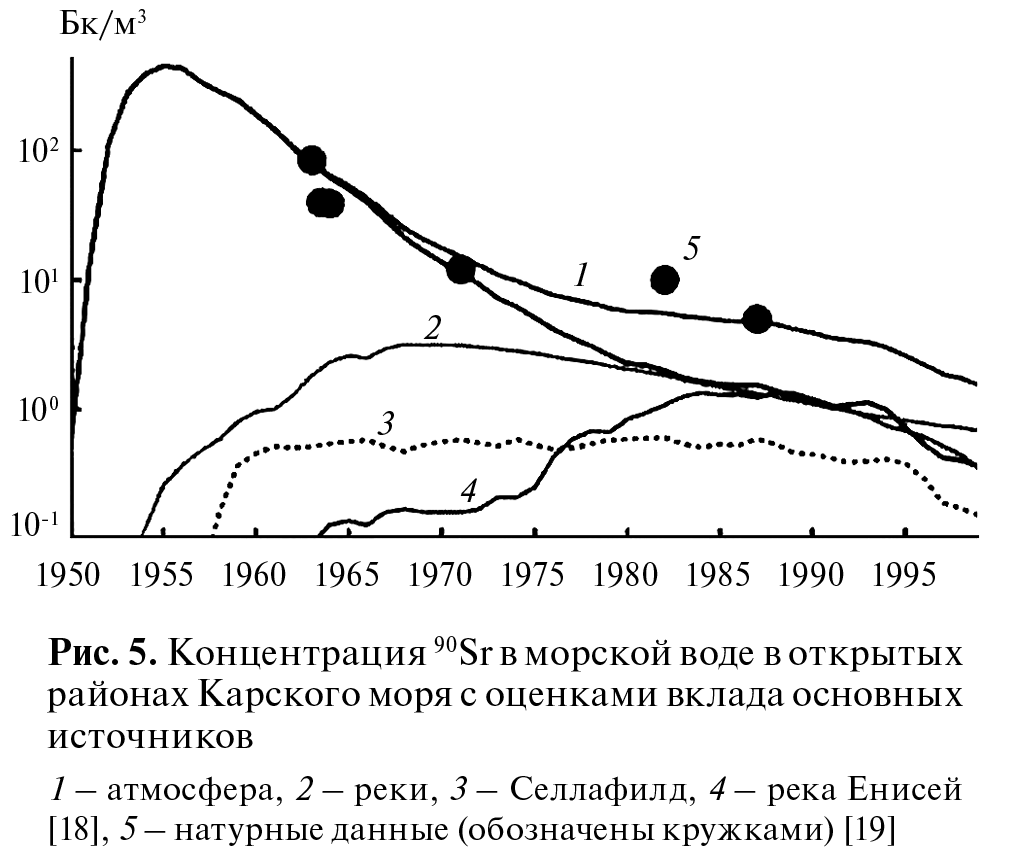 Рис. 5. Концентрация 90Sr в морской воде в открытых районах Карского моря с оценками вклада основных источников 1 – атмосфера, 2 – реки, 3 – Селлафилд, 4 – река Енисей [18], 5 – натурные данные (обозначены кружками) [19]