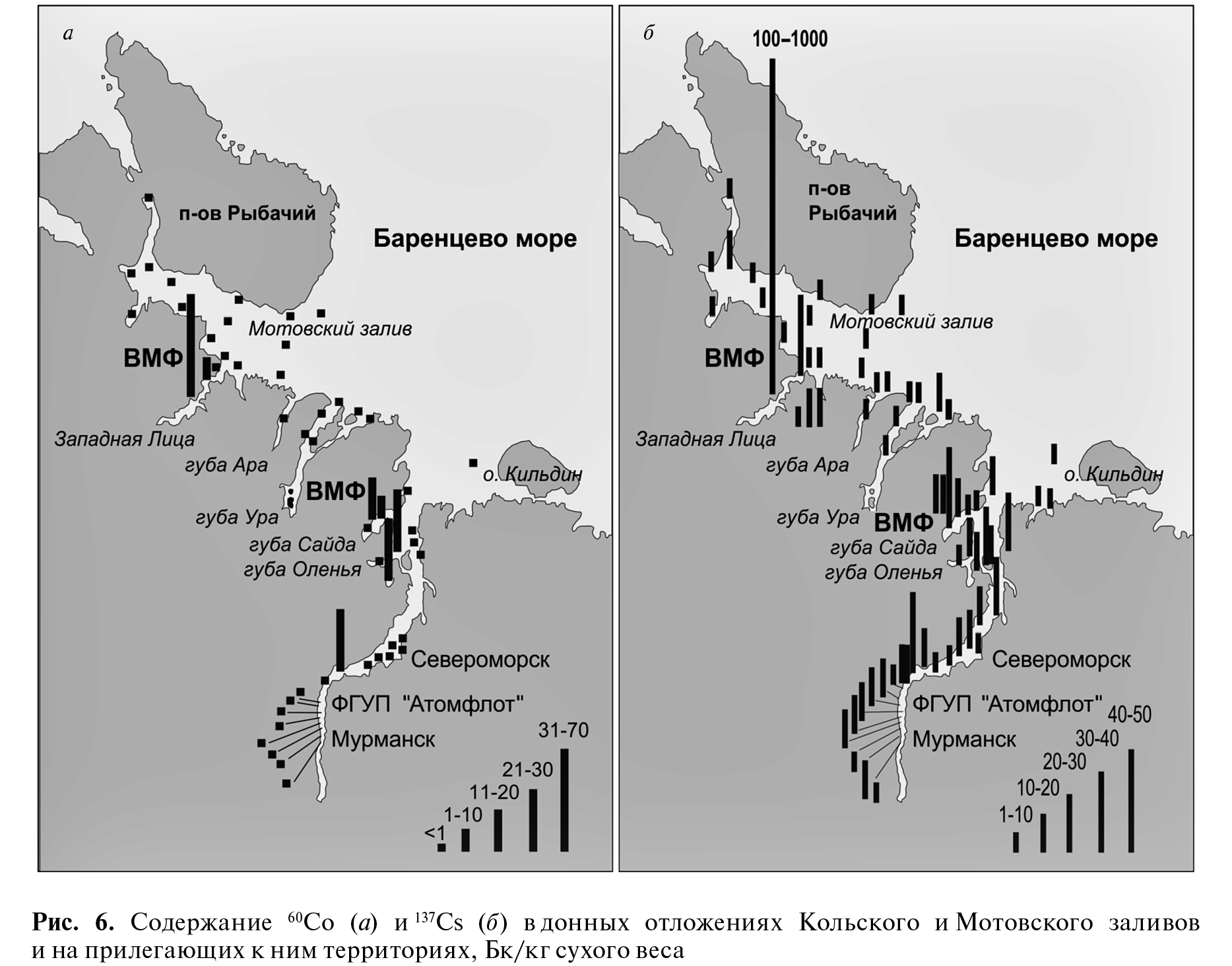 Эксплуатация атомного флота СССР/России. Многолетняя эксплуатация атомного флота привела к появлению заметных локальных загрязнений участков суши и прилегающих к ним участков акваторий арктических морей. Локальные загрязнения появлялись в местах базирования, отстоя, ремонта и обслуживания на береговых технических базах (БТБ), а также утилизации кораблей с ядерными энергетическими установками (ЯЭУ) на судоремонтных предприятиях. В результате таких загрязнений появились участки побережья и акваторий, где концентрация 60Co превышала уровень фона в 30–70 раз, а 137Cs – в сотни и тысячи раз.