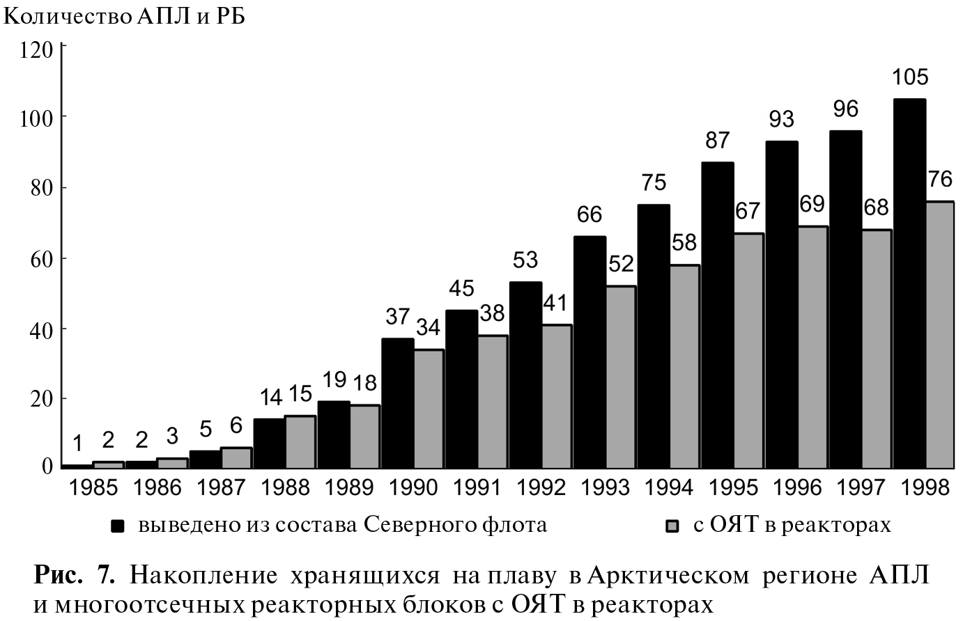 За период 1985 – 1998 гг. из состава Северного и Тихоокеанского флотов было выведено 177 АПЛ, но только из 52 выгрузили отработавшее ядерное топливо (ОЯТ). К концу 1998 г. в пунктах отстоя в Мурманской и Архангельской областях на плаву хранилось 76 АПЛ и многоотсечных блоков с ОЯТ в реакторах (рис. 7). Это создавало серьёзную угрозу обширного загрязнения акваторий арктических морей при возникновении аварийных ситуаций на ядерно- и радиационно опасных объектах, поскольку подлежащие утилизации АПЛ, многоотсечные блоки и суда технического обслуживания, а также объекты инфраструктуры (береговые технические базы, судостроительные и судоремонтные предприятия) в Арктическом регионе локализованы на севере Кольского полуострова – в районе г. Мурманска и в посёлке Гремиха, а также в г. Северодвинске Архангельской области. Совокупность этих ядерно- и радиационно опасных объектов известна в литературе как "ядерное наследие" холодной войны.