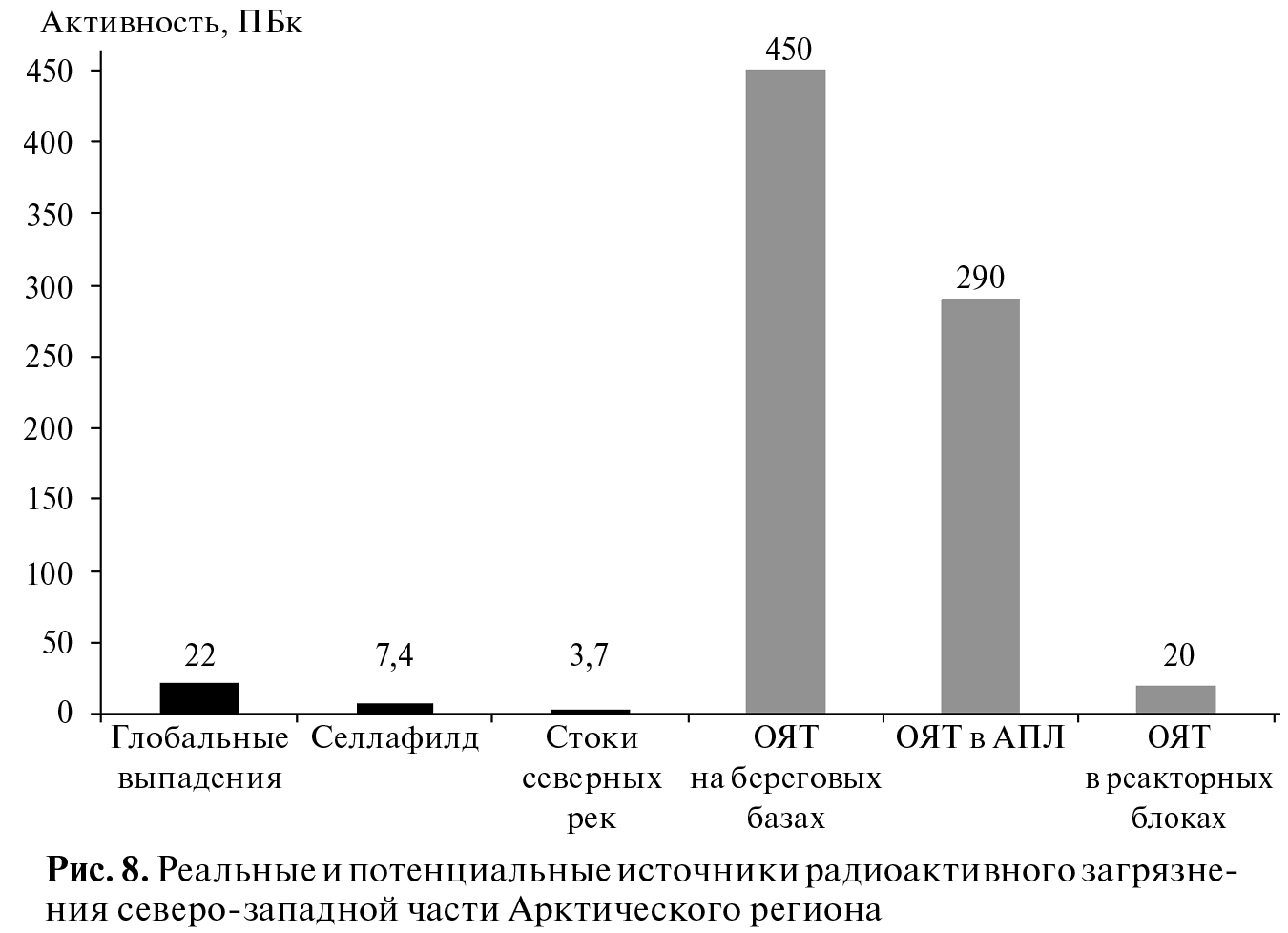 Радиационный потенциал отработавшего топлива, накопленного в реакторах АПЛ и в хранилищах береговых технических баз, к 1998 г. в десятки раз превышал уровни проявившегося к этому времени реального радиоактивного загрязнения Арктического региона от различных источников (рис. 8). Уровень возникших угроз и их нарастание вызывали озабоченность как российских, так и зарубежных учёных и специалистов атомной отрасли.