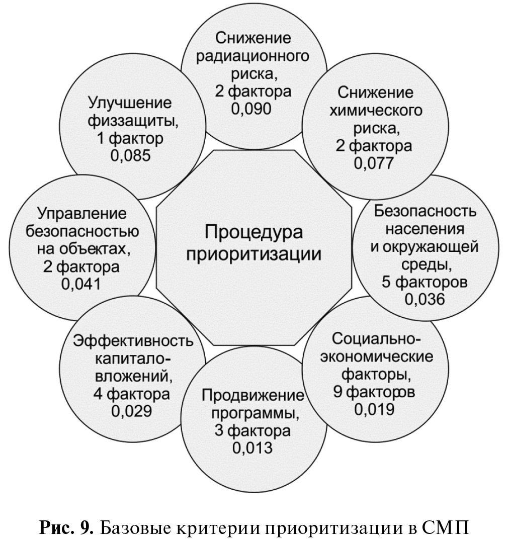 Для приоритизации проектов применялся адаптированный метод, разработанный Агентством по выводу из эксплуатации ядерных объектов Великобритании. Он основан на превращении всех факторов, влияющих на выработку решения, в исчисляемые величины. Базовая структура основных критериев приоритизации отражена на рисунке 9. Каждому критерию соответствует один или несколько факторов, для которых вырабатываются численные оценки. Соответственно, для каждого проекта необходимо получить независимые численные оценки множества факторов. Эксперты провели количественную оценку группы детализированных показателей (метрик) по каждому отдельному фактору, а затем с помощью метода Дельфи была достигнута статистическая согласованность полученных значений и уже по ним определены приоритетные проекты. (Надо заметить, что использование экспертных оценок для выработки числовых значений во всём мире считается эффективным методом.)