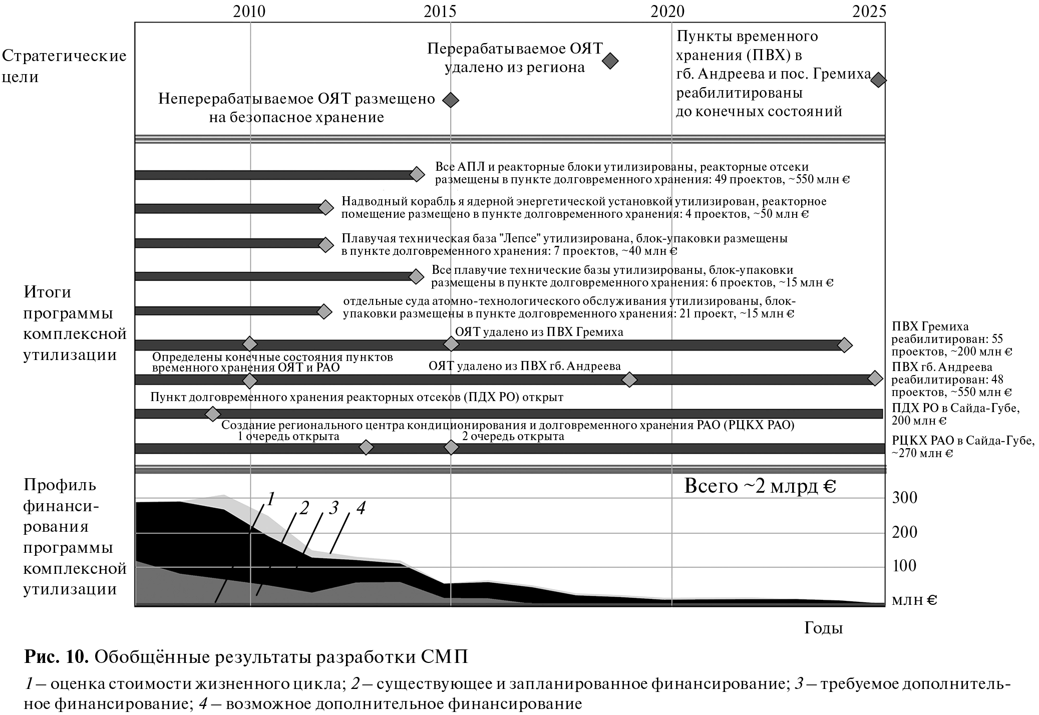 Использование разработанной структуры декомпозиции работ с идентификацией логичес ких связей между проектами, их ранжирование по уровню приоритетности, оценки длительности и стоимости выполнения работ, а также стандартные методы календарного планирования позволили составить перечень всех логически взаимосвязанных мероприятий, реализация которых должна была обеспечить достижение ви́дения (рис. 10). Общее необходимое финансирование программы комплексной утилизации по оценке, приводимой в СМП, достигало ~2 млрд евро, а примерные сроки завершения ключевых этапов Программы при условии выделения необходимых ресурсов находились в интервале 2012–2025 гг. При отсутствии достаточных ресурсов эти сроки могут значительно сдвигаться в будущее. Детальную информацию о методиках, результатах исследований и процедурах, применявшихся при разработке СМП, можно найти в [30].