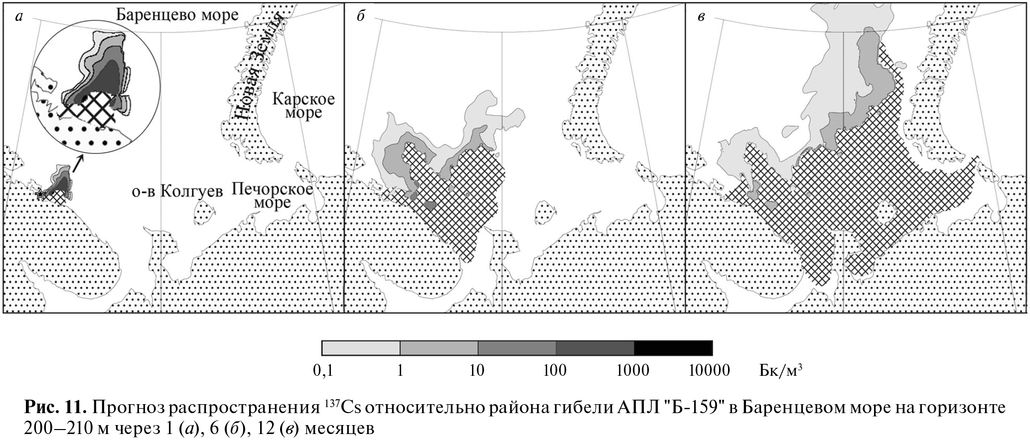 Недавно выполненное исследование ИБРАЭ РАН, Института вычислительной математики им. Г. И. Марчука РАН, Института океанологии им. П. П. Ширшова РАН и НИЦ "Курчатовский институт" [39] – пример модельного изучения возможных последствий тяжёлой аварии на АПЛ Б-159 с выходом активности в окружающую среду. После анализа различных сценариев аварии был выбран наиболее экстремальный из них, с возникновением самоподдерживающейся цепной реакции и разрушением активной зоны. Оценён максимально возможный выброс радионуклидов в окружающую среду (около 50 ТБк) и проведены расчёты распространения возникшего загрязнения в морской среде (рис. 11). Эти расчёты проводились в рамках модели Мирового океана, разработанной совместно Институтом вычислительной математики РАН и Институтом океанологии РАН [40].