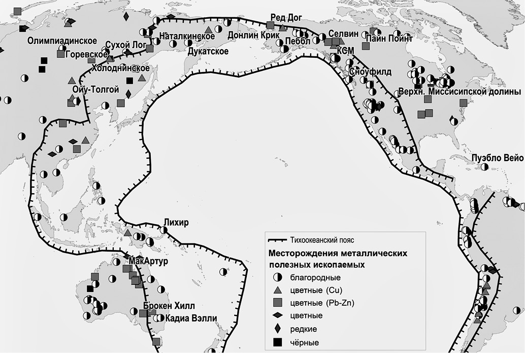 Тихоокеанский рудный пояс (ТРП) огромным кольцом охватывает активные окраины континентов вокруг одноимённого океана (рис. 1). Недра ТРП богаты не только благородными, но и чёрными, цветными и редкими металлами, а также другими ценными полезными ископаемыми. Интерес к изучению отечественными геологами минерального богатства ТРП стимулировала работа С. С. Смирнова "О Тихоокеанском рудном поясе" [1] – выдающееся обобщение металлогенических знаний 1940-х годов, значение которого сохраняется и сегодня.