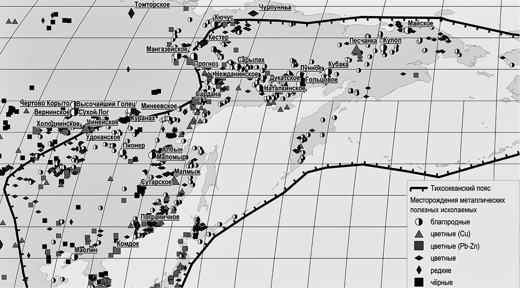 Рис. 2. Распространение рудных металлических месторождений в российском Восточном секторе ТРП (по данным ГИС-анализа)