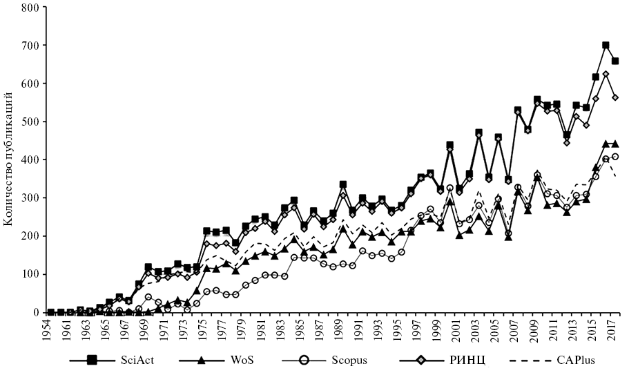 Для сбора и анализа исходной информации использованы: институтская информационно- аналитическая система SciAct [9], глобальные политематические базы данных (БД) Web of Science Core Collection (WoS-CC) и Scopus, специализирую щаяся на химии и смежных дисциплинах глобальная БД Chemical Abstracts Plus (CAPlus на платформе SciFinder) и национальная политематическая БД Российский индекс научного цитирования (РИНЦ). Номенклатура реферируемых изданий, характер индексации, ретроспектива и функциональные возможности этих ресурсов различны. Их совместное применение обеспечивает более полный и глубокий анализ интересующего информационного массива, недостижимый при отдельном использовании любого из них. Поиск первичных данных выполнен в мае 2018 г. по аффилиации / гео локации и профилям ИК СО РАН в базах данных.