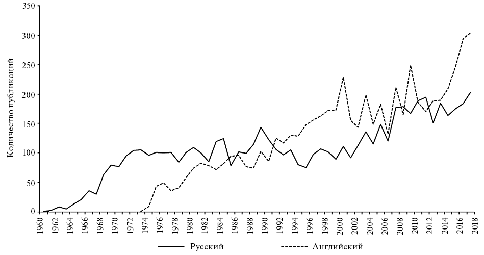 Основной язык непатентных публикаций ИК СО РАН – английский (10,3 тыс. работ, из них 4,0 тыс. – перевод с русских оригиналов), за ним следует русский (6,3 тыс.). Оригинальных пуб ликаций на английском и русском 6,4 и 6,3 тыс. соответственно. Динамика оригинальных журнальных публикаций на русском и английском языках (по 6,1 тыс. на каждом) представлена на рисунке 3: до 1991 г. доминировали первые, затем стали преобладать вторые. Патентные пуб ликации преимущественно русскоязычные – 1,4 тыс., на английском языке – 128, на немецком – 26, на японском и китайском – по 23, на французском – 19, на корейском – 4, на датском, финском, португальском, голландском и шведском – по 3, на испанском и румынском – по 2, на венгерском, польском и турецком – по 1.