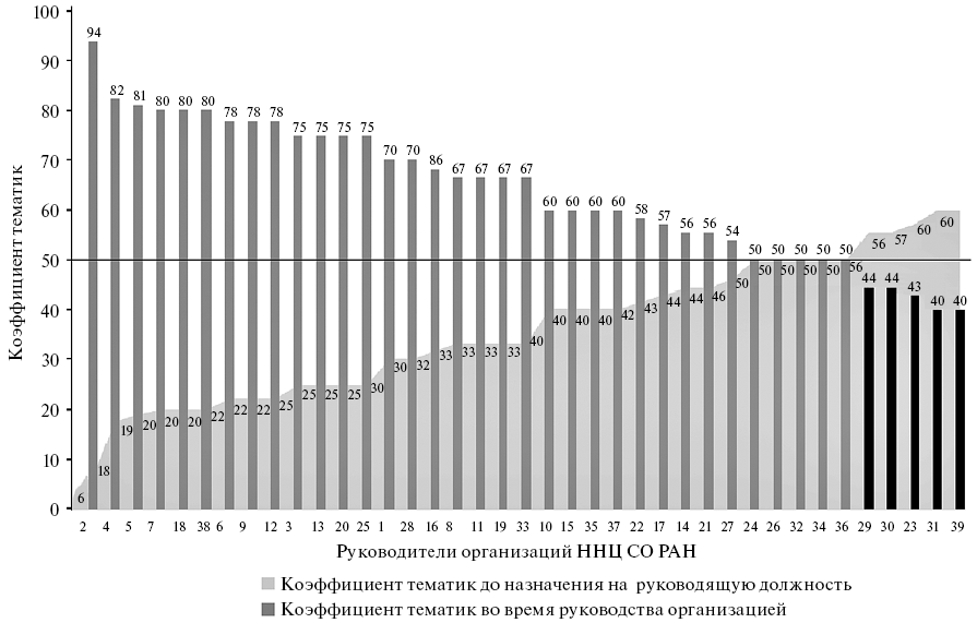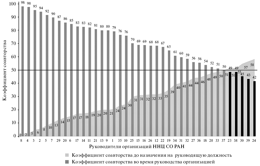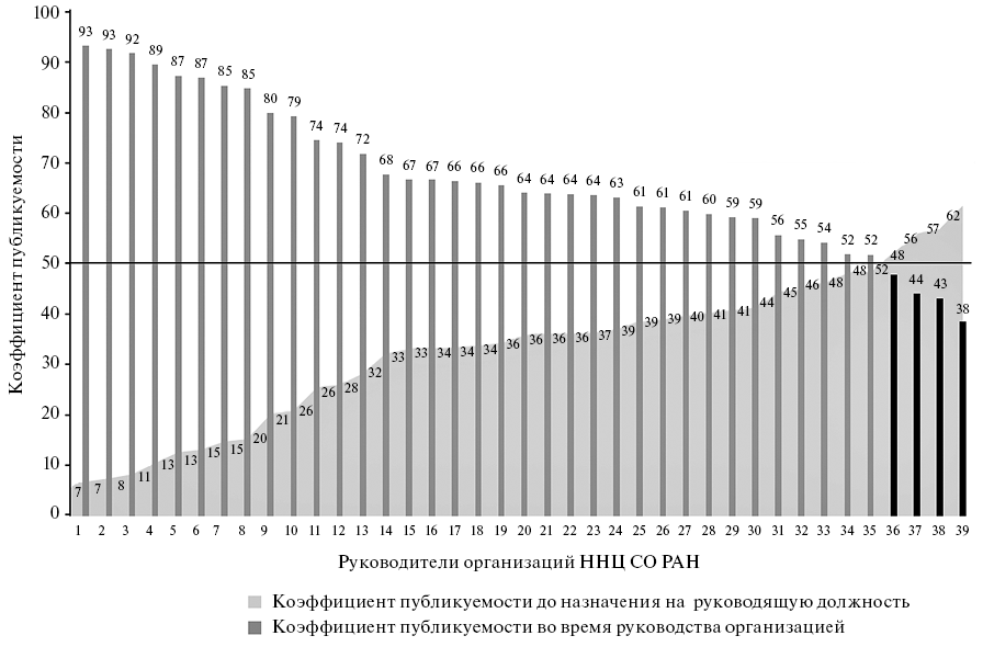 Рис. 1. Коэффициенты публикуемости руководителей организаций ННЦ СО РАН до назначения на руководящую должность и во время руководства организацией