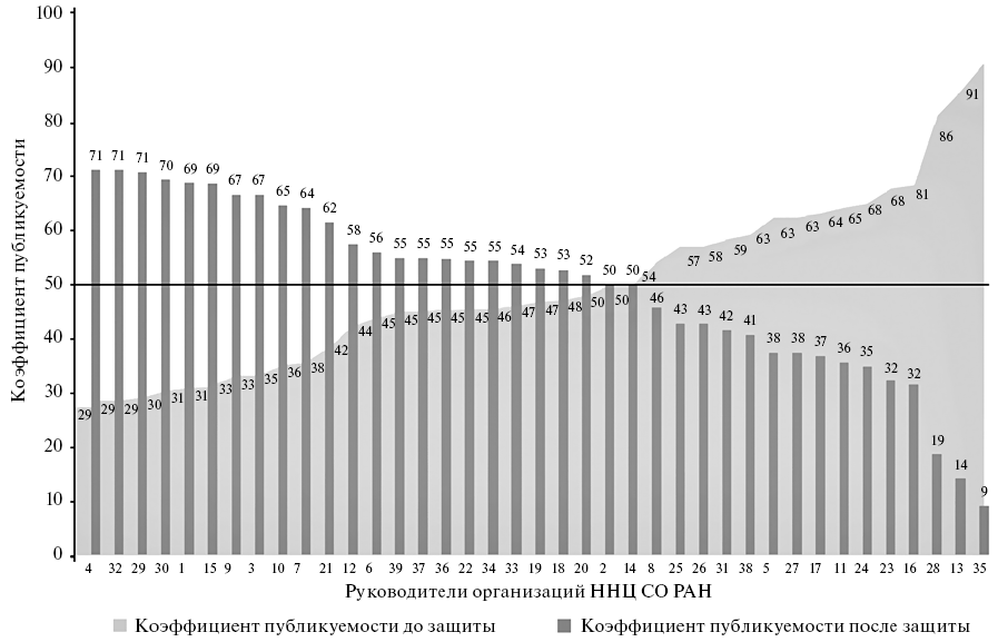 На рисунке 5 показаны коэффициенты пуб ликуемости до и после защиты диссертационных работ. Расчёт коэффициентов проводился по приведённой ранее формуле. У 15 руководителей число публикаций в течение 3 лет после защиты сократилось по сравнению с тремя годами до представления диссертации (включая год защиты), у 22 – увеличилось, у 2 учёных осталось прежним.