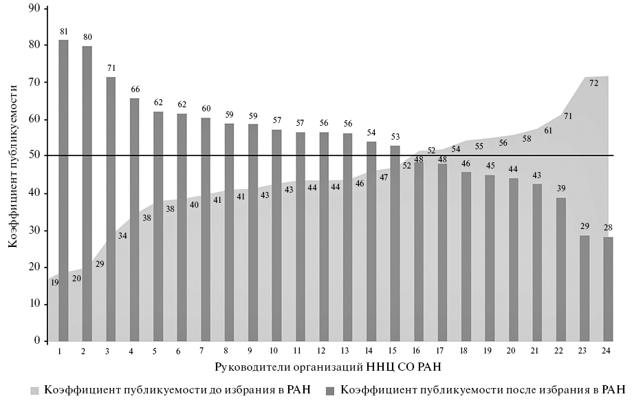 На рисунке 6 продемонстрировано распределение публикаций в 3-летние периоды до и после избрания руководителей институтов членами-корреспондентами и действительными членами РАН (если у кого-то было два звания, учитывалось присуждение последнего). Коэффициенты публикуе мости вычислялись описанным выше способом. Из 24 руководителей институтов ННЦ СО РАН, имеющих звания члена-корреспондента или академика РАН, у 15 (63 %) пуб ликационная активность после избрания повысилась, тогда как у 9 учёных она снизилась. В целом за исключением крайних позиций графика наблюдается относительно равномерное распределение.