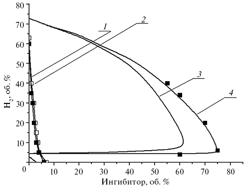 Рис. 1. Влияние ингибиторов АКМ (1, 2), СО2 (3) и N2 (4) на концентрационные пределы воспламенения водородо-воздушных смесей при 1 атм.
